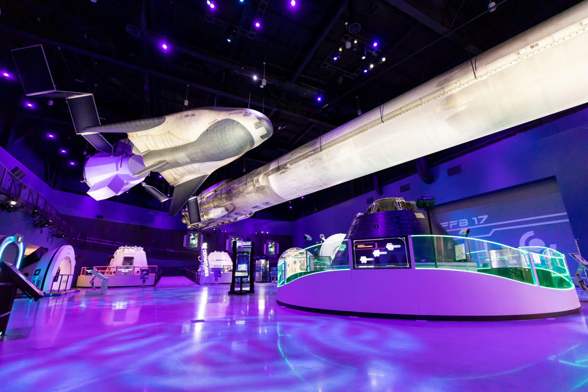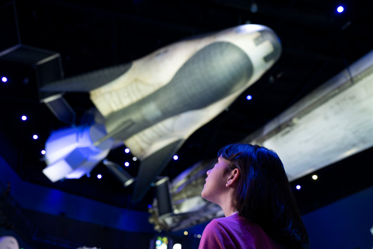 Romfergen Atlantis er utstilt i en dramatisk setting der du virkelig kan se detaljene på nært hold. Det finnes også interaktive opplevelser og en simulert oppskyting.